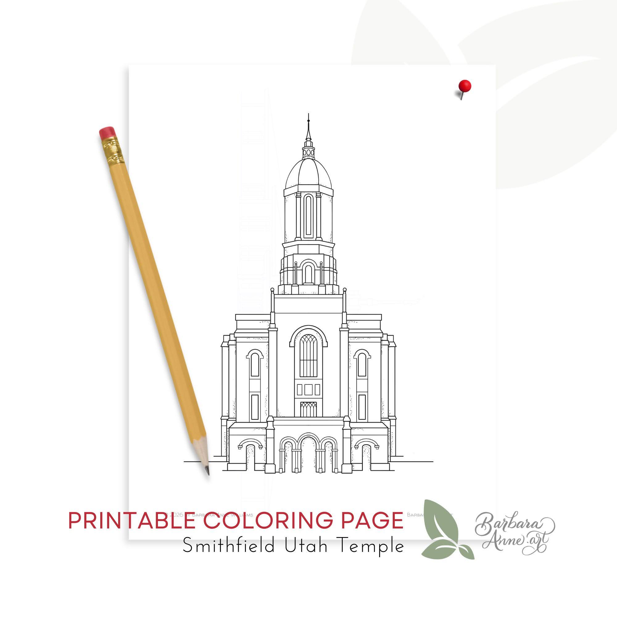 A printable coloring page of the Smithfield Utah Temple (digital download).